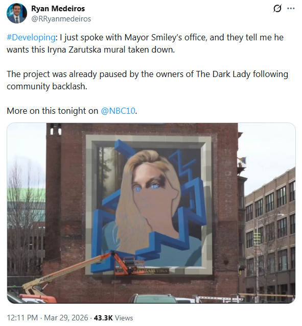 As reported on X by local journalist Ryan Medeiros, Mayor Smiley wishes for the removal of the mural honoring the Ukrainian refugee who was stabbed to death by a foreign national.