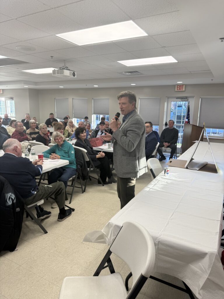 Standish, Maine – Republican gubernatorial candidate Jonathan Bush spoke Tuesday at the Cumberland County GOP meeting, where he introduced himself to attendees, outlined his background in healthcare and business, and fielded a series of questions on issues ranging from taxes and education to healthcare costs, border security, and transgender athletes in girls’ sports.