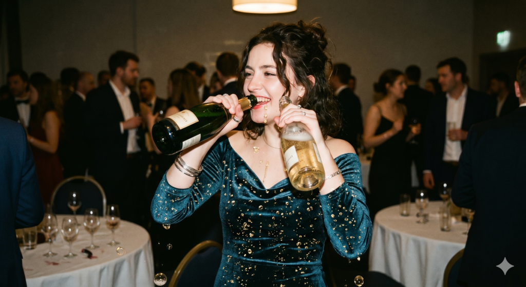 The clip shows some members of the press picking up bottles of wine and champagne from tables as the hall was being cleared. One woman is seen carrying two bottles and walking away without stopping.
