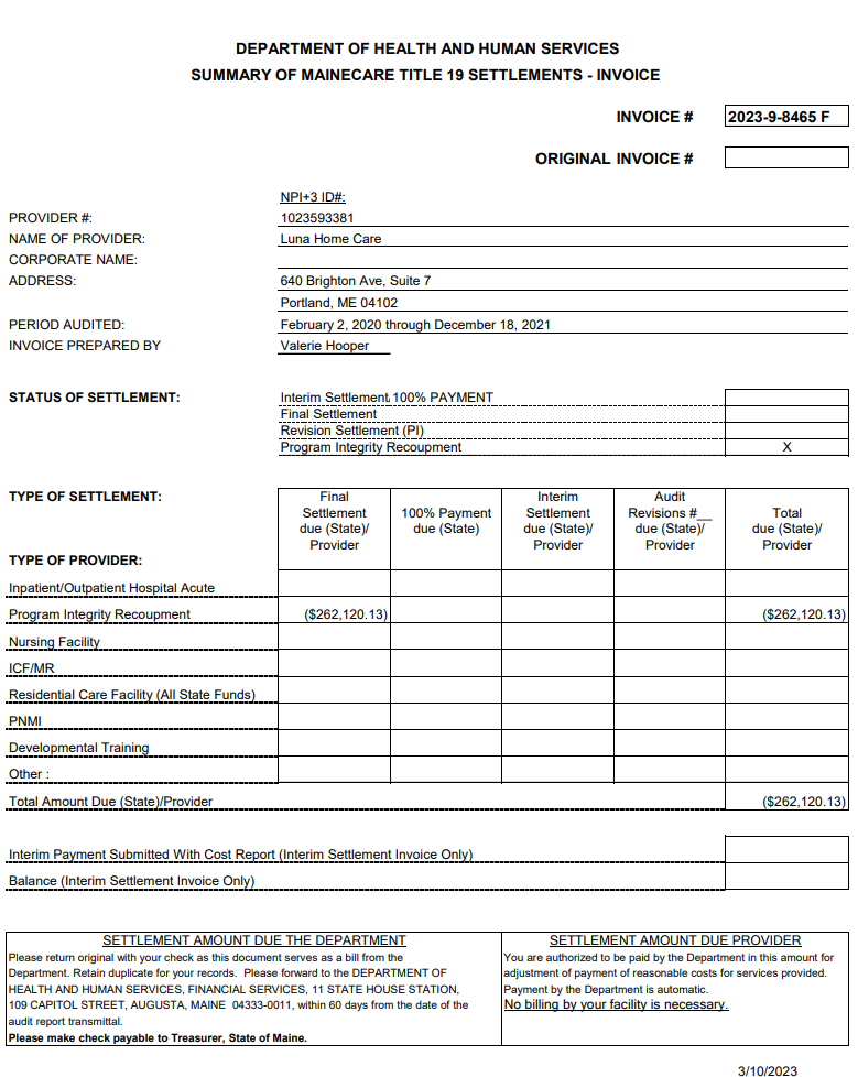 MaineCare’s Office of Program Integrity sent Luna’s executive director, Marian Abu, its notice of violation on March 13, 2023, ordering the company to repay $262,120.