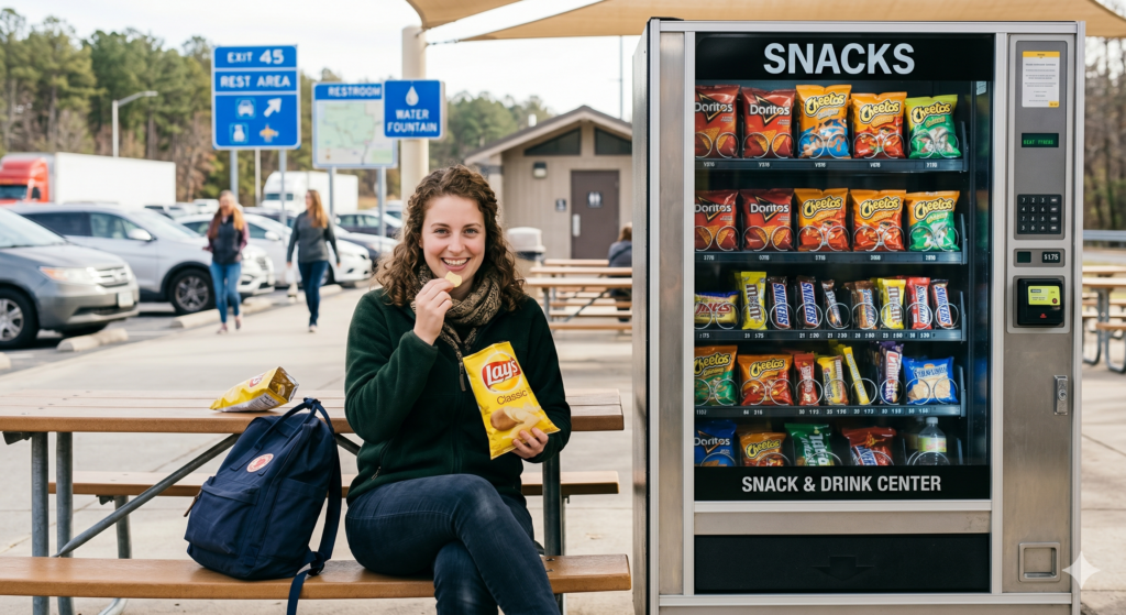 That’s when he noticed the sign by the rest-area’s lean-to telling motorists to “Snack Wisely.”