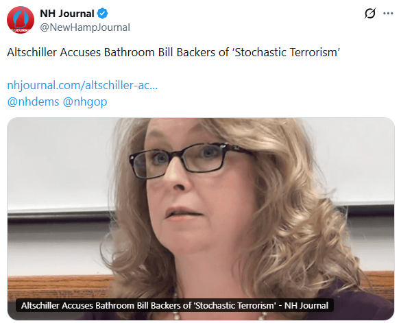 Trans-advocate Sen. Debra Altschiller (D-Stratham) couldn’t restrain herself while the committee considered bills HB 1217, HB1299, and HB1447, which dictate biological sex determines access to female restrooms, locker-rooms, and sports competitions disregarding “gender identity.”