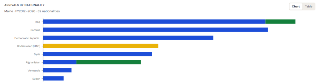 The national statistics also took an elevator ride down to a record-low 7,500 refugees in 2026, declining 94%, from 125,000 – a new Trump record in modern USRAP history. While data available aligns resettlement data and formula-based grants, it seems the story unfolds further in Maine, where a blue-curtain appears meticulously sewn by nonprofits considered friends of the Democratic party.