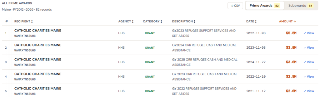 In data, federal grants rise in volume with resettlement spikes, painting the financial link between headcounts and organizational funding. As for Maine, this model has connected substantial funds directed to organizations associated with the Office of Maine Refugee Services. The Maine Wire also documented similar cash grants flowing to familiar faces in Lewiston and Portland, like Gateway Community Services.