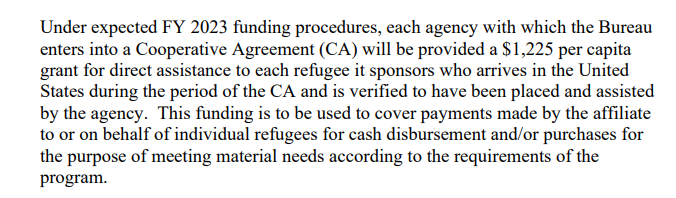 These refugees receive extraordinary benefits used to incentivize initial resettlement, with affiliated agencies receiving a โReception and Replacement Grantโ typically around $2,500 per refugee admitted, intended to cover 90 days of basic needs like housing, food, and administrative costs.