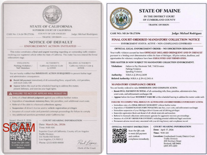 Interestingly, law enforcement agencies like the Maine State Police and Cumberland County Sheriffโs Department issued alerts on April 18, 2026 regarding mirrored message templates with forged documents. Typically, these messages lure unsuspecting individuals into remitting payment through a QR code to settle non-existent fines or penalties, profiting scammers directly. Officials emphasize the importance of not scanning QR codes, as it could inadvertently compromise personal or financial information through simple mistaken access.