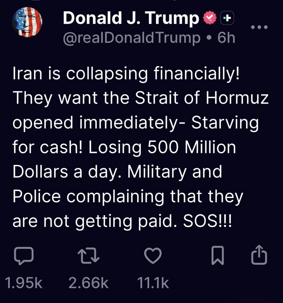 Against that backdrop, reports of Iranโs worsening finances have taken on added significance. Trump wrote this week that Iran is desperate to reopen the strait, saying the regime is effectively starving for cash. The broader reporting around the ceasefire extension and Tehranโs fractured internal politics suggests the regime is under heavy pressure as negotiations drag on and the blockade chokes revenue.