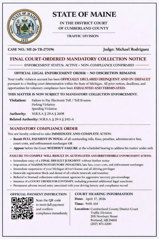 Law enforcement agencies across the state, including the Maine State Police, are warning Mainers about a new scam sending false court notices appearing to be from the Cumberland County District Court, demanding immediate payment. [RELATED: Nearly $500K Restored to Maine Victims of Crypto Scam…] Scammers are reportedly sending an image of the document to victims throughout the state via text messages. The authentic-looking document informs victims that they have a traffic violation that has been declared delinquent and that they are required to immediately repay a toll along with fines, penalties, administrative fees, and court costs or appear at the…